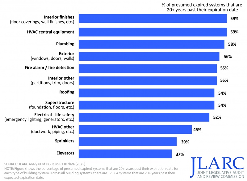 The state’s central repository of data on state-owned buildings and systems is a database of agency-reported data called “M-R FIX.” The Department of General Services (DGS) developed M-R FIX to allocate maintenance reserve funds, the state’s fund for eligible maintenance projects that cost between $25,000 and $2 million ($4 million for roofs). M-R FIX has incomplete and incorrect data, but it is at least sufficient to draw a few basic conclusions about the buildings that house state government and public higher education operations. M-R FIX data shows that about half of state-owned buildings are almost 50 years old or older, and about one-third of the systems (e.g., HVAC, roofing, plumbing, etc.) in state buildings are past their expected lifespans (i.e., expired), according to generic lifespan metrics. In addition, many building systems presumed to be expired are 20+ years past their expected lifespans (figure, next page).