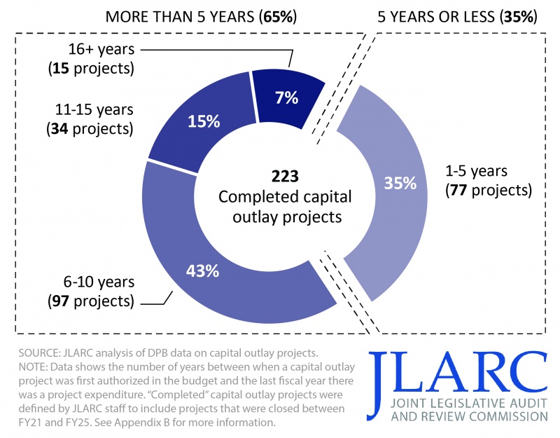 Majority of capital outlay projects completed since FY21 exceeded five years to complete, and some exceeded a decade